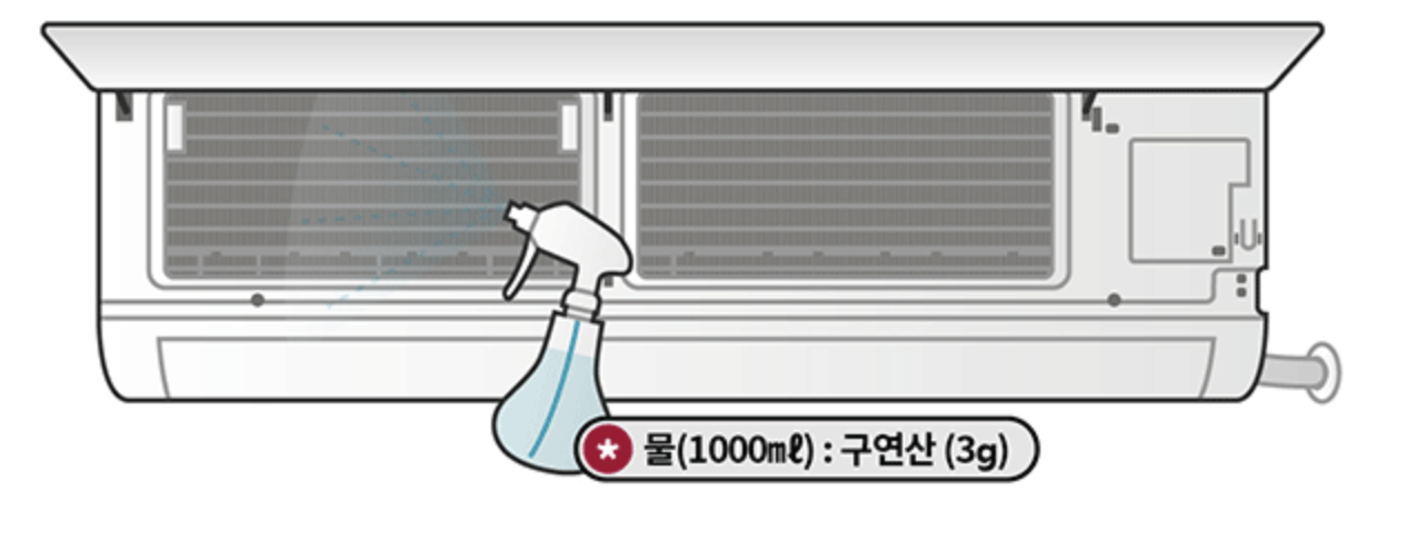 필터 외에 에어컨 내부 열 교환기를 청소하는 방법은 필터를 제거한 상태에서 구연산을 물 1000ml과 구연산 3g 비율로 희석하여 실내 열 교환기에 충분히 뿌려주면 된다. 이후 냉방 운전을 최저 온도(18도)로 설정하여 30분 이상 운전해 준다. 이때 제품 내부 냄새 입자들이 제품 밖으로 배출되어 냄새를 줄여줄 수 있다.