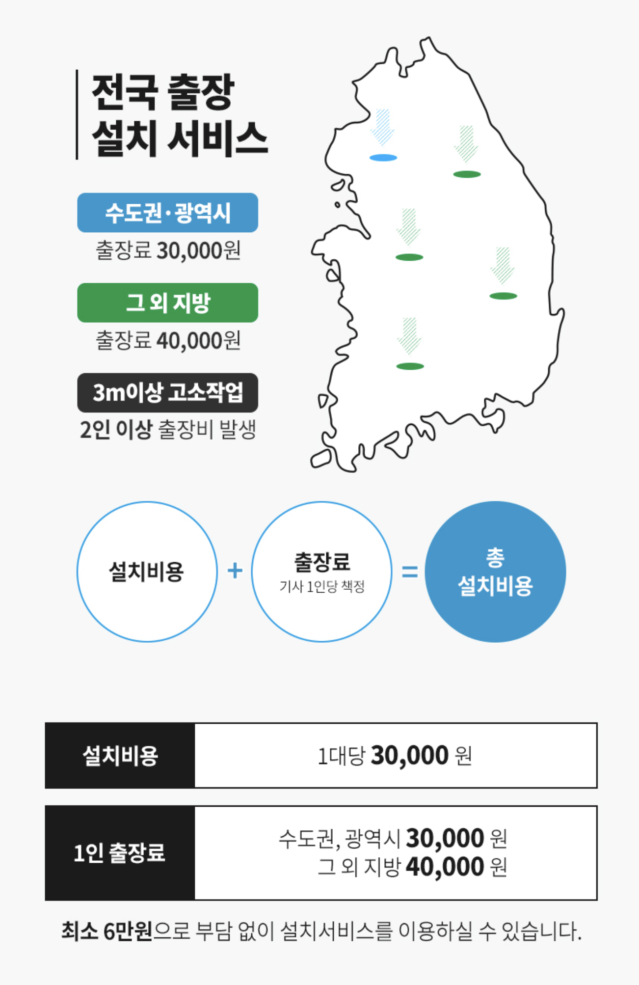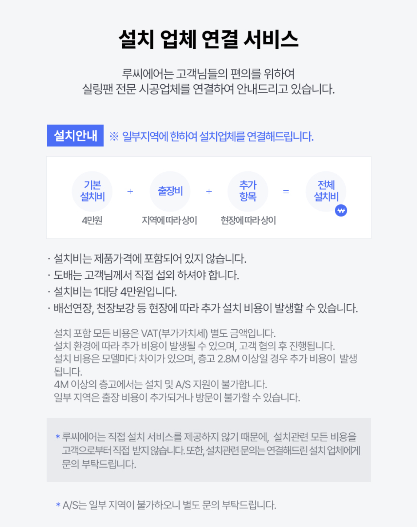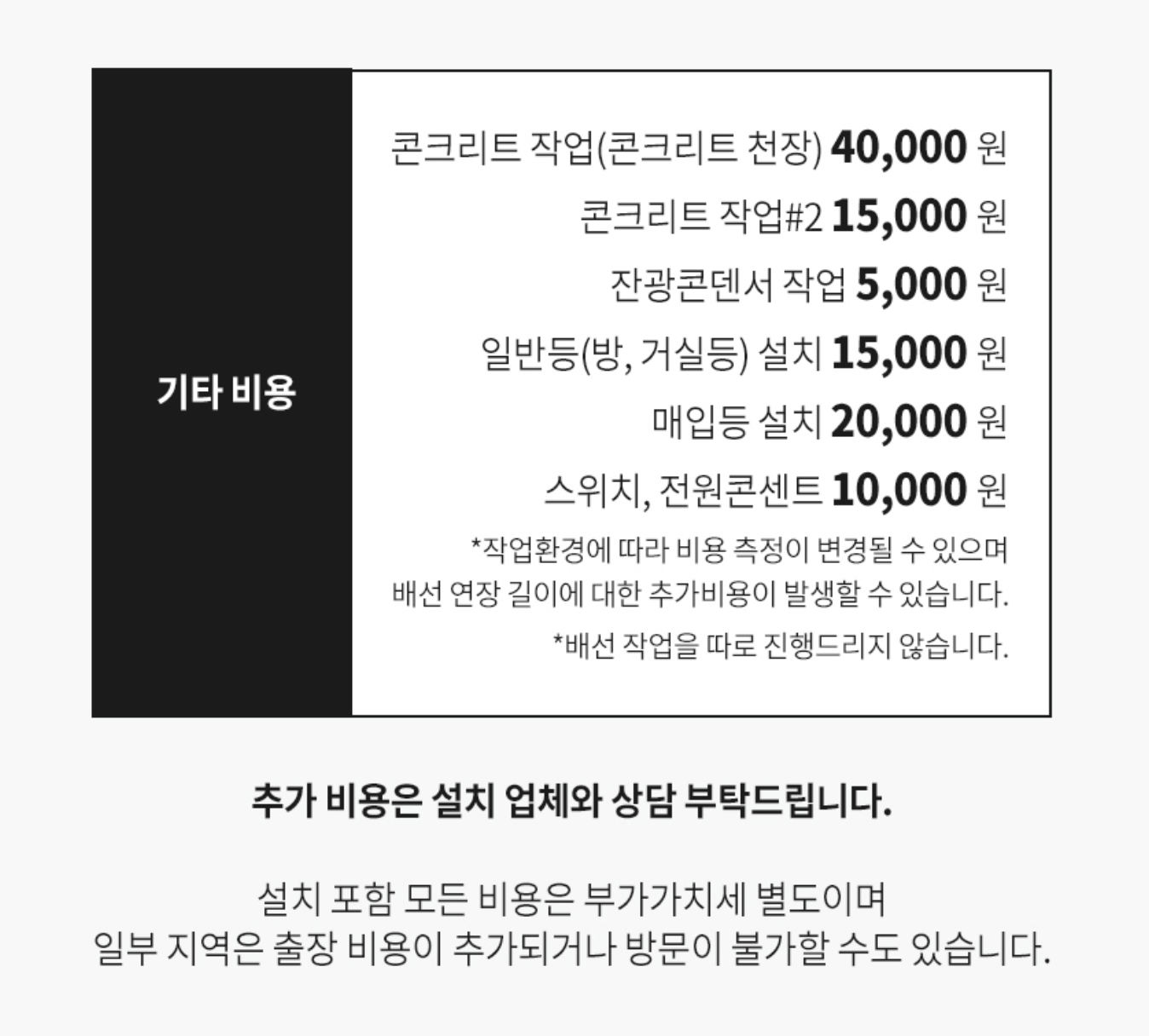 대부분 실링팬을 구매하게 되면 설치 업체들을 연결해 주는데, 루씨에어 브랜드 기준으로 기본 설치비 4만 원 + 지역별 출장비 + 추가 항목에 따른 비용이 발생한다고 한다. 다른 브랜드인 에어블로우 기준으로는 1대당 설치비 3만 원 + 지역별 출장비 + 추가 항목에 따른 비용(위의 이미지 참고)이 발생한다고 한다.