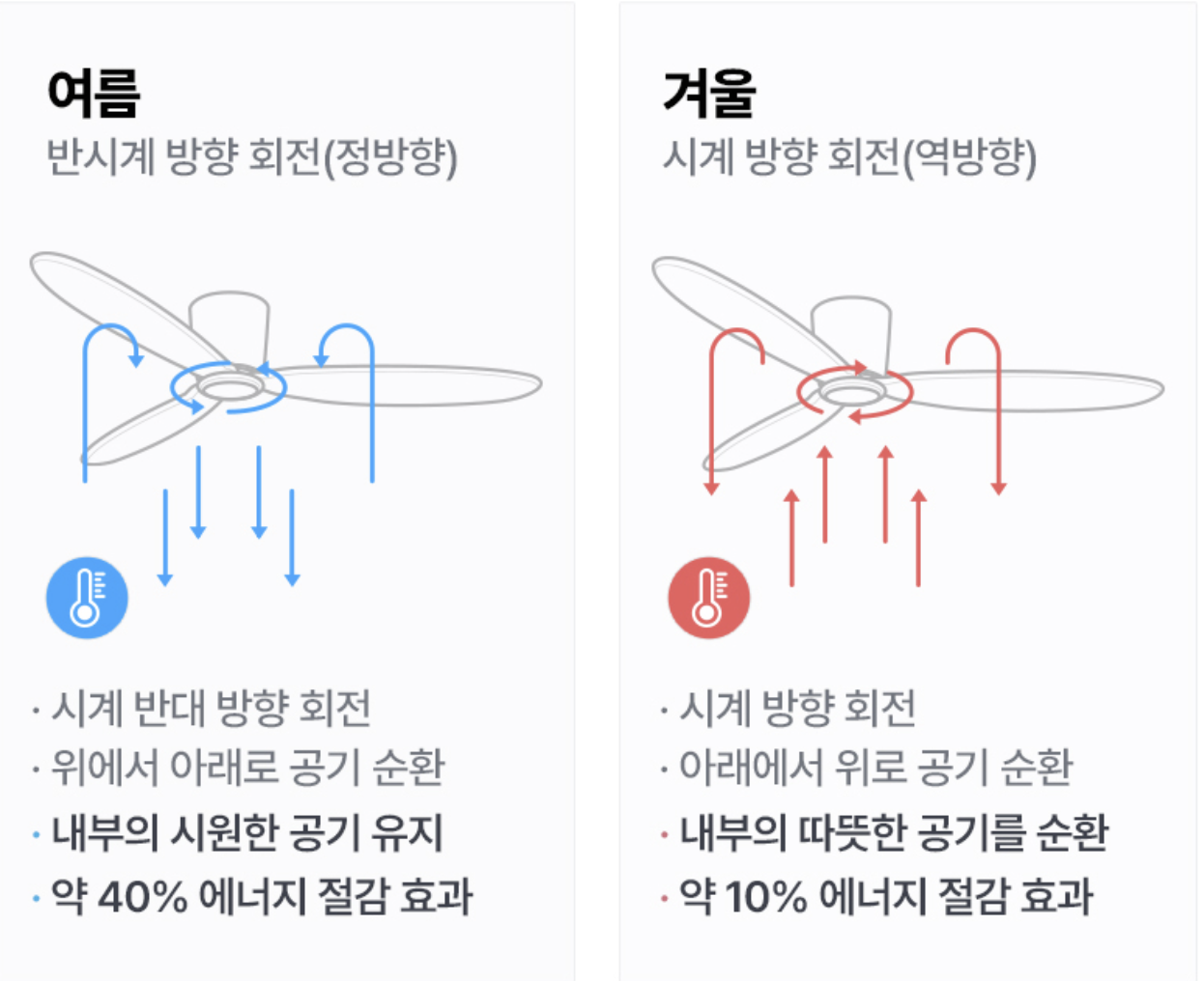 여름에는 위에서 아래로 공기를 순환시켜서 내부의 시원한 공기를 유지시키고 겨울에는 아래에서 위로 공기를 순환시켜 내부의 따뜻한 공기를 순환시킨다. 이때 실내 온도 불균형을 해소시켜 냉난방비 절감에 탁월한 효과가 있다.